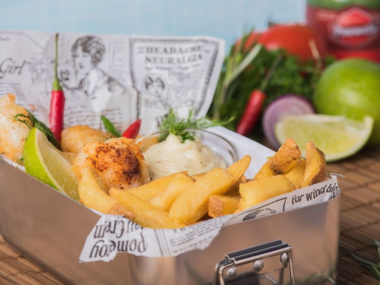 Aan de overkant van het Kanaal zijn ze er dol op: stukjes witte vis in een krokant jasje met dikke frietjes erbij. Wij maakten een pikante variant met potato wedges en serveerde met onze smeuïge tartaarsaus.